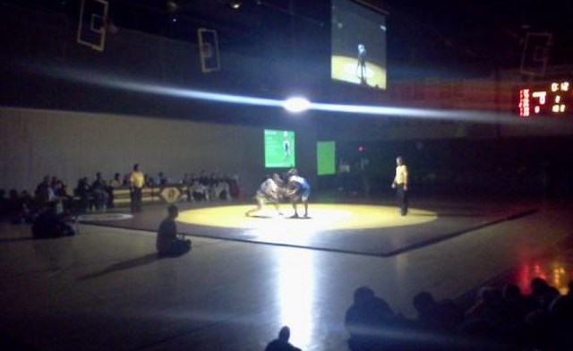 Simply, it was a near-impossible situation in which to have a conversation. The lights were dimmed for the finals, the music was turned way up and blaring, and it was akin to a low-budget pro wrestling enterprise than a high school meet.