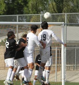 La Sierra's Christian Salgado (19) skies for a header the goes over the bar in the second half on Tuesday. / Dwain Linden Photography