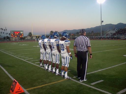 Los Angeles Crenshaw varsity football players line up with a sideline referee before the start of the Cougars’ 43-31 victory over Corona Santiago on Friday, Aug. 24, 2012. / Dennis Pope Photography