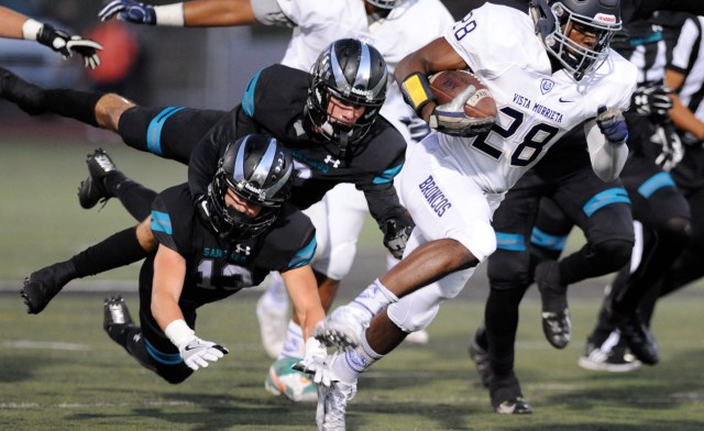 Vista Murrieta scored 20 unanswered points in the second quarter en route to a 31-13 halftime lead, but the third quarter was more of a mess than the referees could stand. The crew ejected two players for fighting and sent both teams to their respective sidelines for, ahem, an unscheduled time out.
