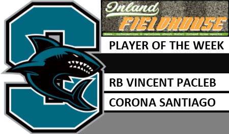 Corona Santiago senior RB Vincent Pacleb has been selected InlandFieldhouse.com’s Player of the Week after his Week 0 performance in a 42-27 victory over Murrieta Valley in a non-league game on Friday, Aug. 17, 2018.