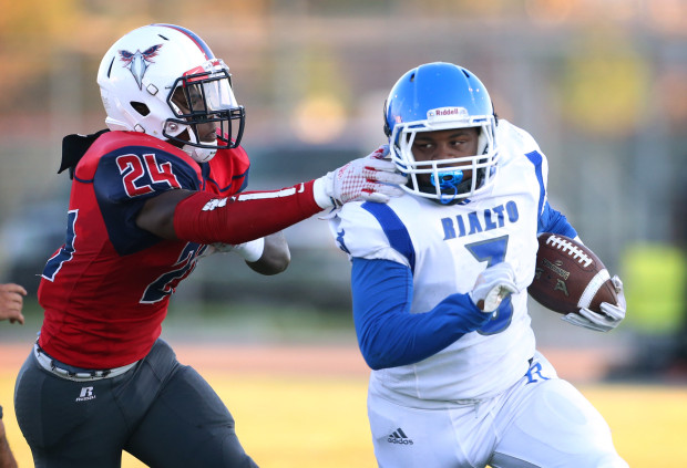 Rialto’s Jamal Moorefield (right) ran past La Sierra on Thursday, August 23, 2018. (Photo by Stan Lim for SCNG)