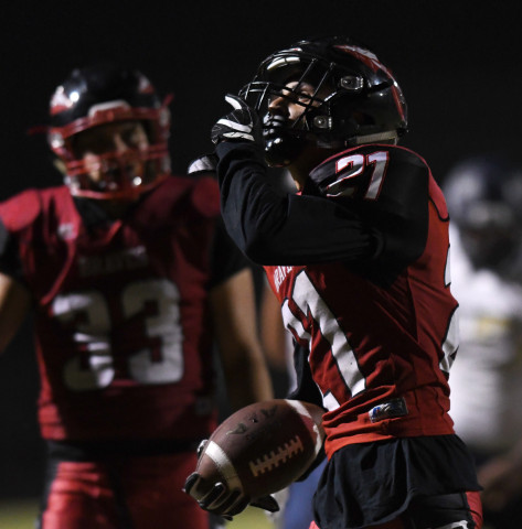 Norte Vista’s Miron Hazem celebrates his touchdown against Moreno Valley during the fourth quarter on Friday, August 31, 2018. / Photo by Milka Soko for SCNG