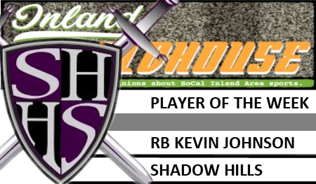 Indio Shadow Hills senior RB Kevin Johnson has been selected InlandFieldhouse.com’s Player of the Week after his Week 4 performance in a 55-16 victory over Hemet in a nonleague game on Friday, Sept. 14, 2018.