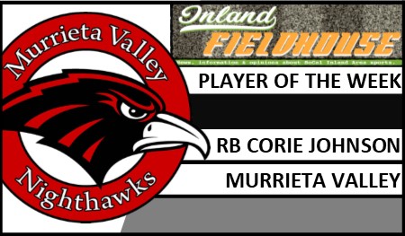 Murrieta Valley senior RB Corie Johnson has been selected InlandFieldhouse.com’s Player of the Week after his Week 1 performance in a 59-14 victory over Menifee Paloma Valley in a nonleague game on Friday, Aug. 30, 2019.