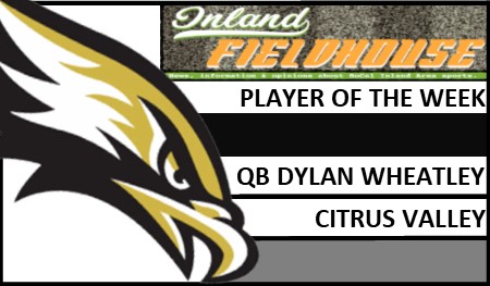 Redlands Citrus Valley junior QB Dylan Wheatley has been selected InlandFieldhouse.com’s Player of the Week after his accurate Week 2 performance in a 42-0 shutout victory over Ontario Colony in a nonleague game on Friday, Sept. 6, 2019.