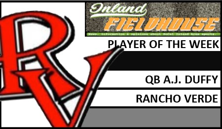 MoVal Rancho Verde sophomore QB A.J. Duffy has been selected InlandFieldhouse.com’s Player of the Week after his outstanding Week 5 performance in a 63-35 victory over Norco in a nonleague game on Friday, Sept. 27, 2019.