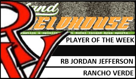 MoVal Rancho Verde senior RB Jordan Jefferson has been InlandFieldhouse.com’s Player of the Week after his defining Week 10 performance in a 44-0 victory over Menifee Heritage in a Ivy League game on Thursday, Oct. 31, 2019.