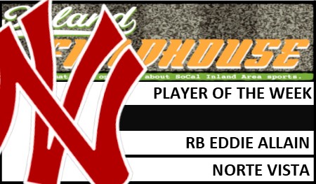 Riverside Norte Vista sophomore RB Eddie Allain has been InlandFieldhouse.com’s Player of the Week after his career-best Week 11 performance in a 46-20 victory over Rancho Mirage in a CIF-Southern Section Division 10 1st Round game on Friday, Nov. 8, 2019.