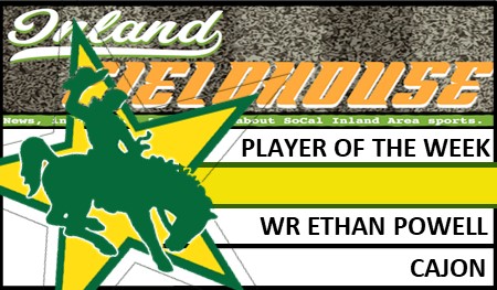 San Bernardino Cajon senior Ethan Powell has been selected InlandFieldhouse.com’s Player of the Week after a bonkers both-ways Week 8-B performance as the Cowboys winded Beaumont, 54-6, in a Citrus Belt League game on Friday, Oct. 15, 2021.