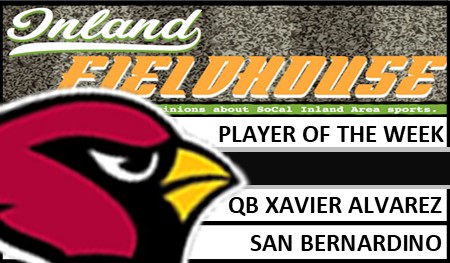 San Bernardino junior Xavier Alvarez has been selected InlandFieldhouse.com’s Player of the Week after turning in a practically perfect Week 0 performance as the Cardinals blasted Desert Mirage, 76-0, in a nonleague game on Friday, Aug. 19, 2022.