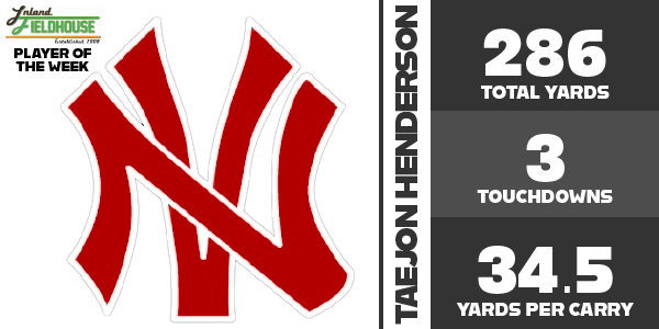 Norte Vista senior Taejon Henderson has been selected InlandFieldhouse.com’s Player of the Week after proving unstoppable in Week 1 as the Braves pummeled Shadow Hills, 49-6, in a nonleague game on Thursday, Aug. 24, 2023.