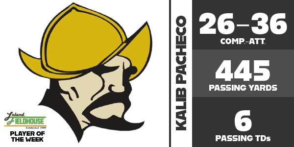 Don Lugo junior Kalib Pacheco has been selected InlandFieldhouse.com’s Player of the Week after a big-armed performance as the Conquistadores defeated Santa Paula, 45-31, in a CIF-Southern Section Division 12 first round playoff game on Friday, Nov. 3, 2023.